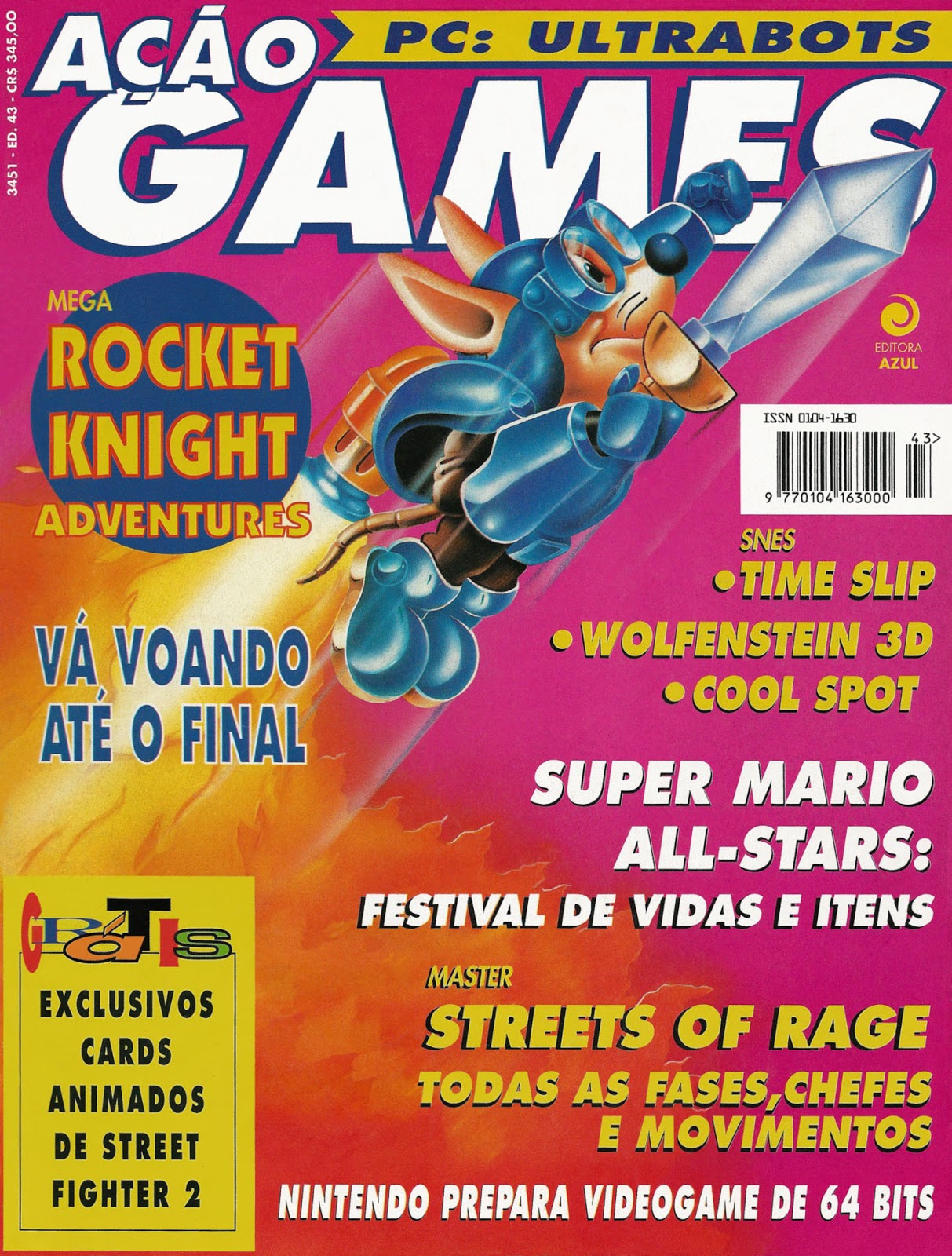 Lançada em setembro de 1993, essa edição da Ação Games traz como matéria de capa o excelente game de plataforma Rocket Knight Adventures, para Mega drive.